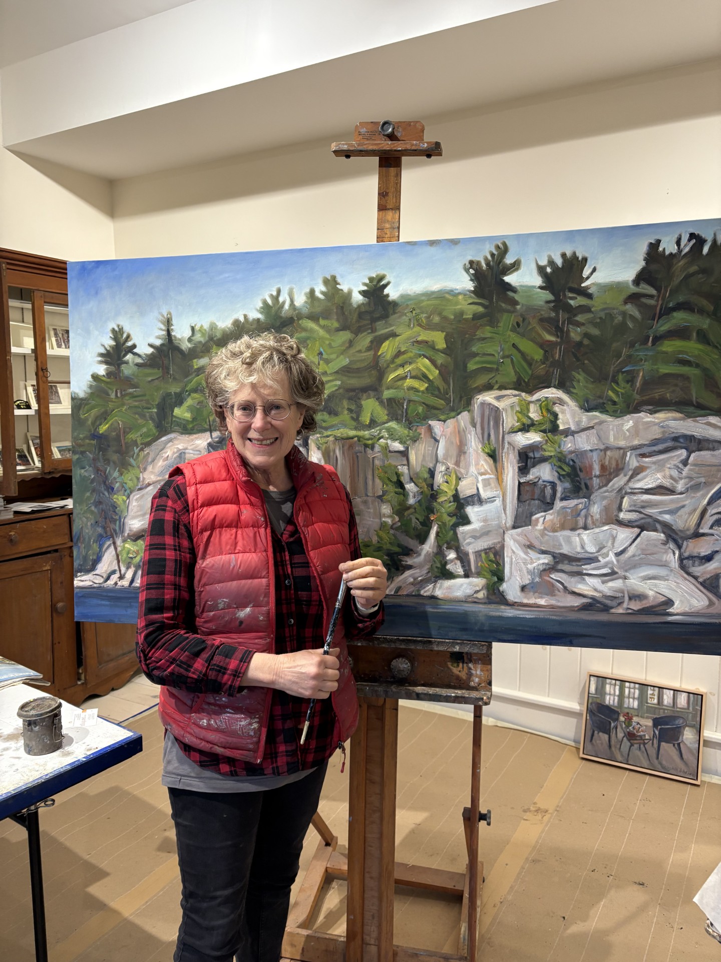 Elizabeth Johnson is a plein air and studio landscape painter whose work captures the character and quiet strength of Ontario’s northern wilderness. Based near Dorset on the edge of Algonquin Park, she has spent more than three decades painting the lakes, forests and small communities of Algonquin, Haliburton and Muskoka. Her paintings reflect a deep, lived familiarity with the land; she works outdoors whenever possible, often completing pieces in a single session as she races the shifting light.